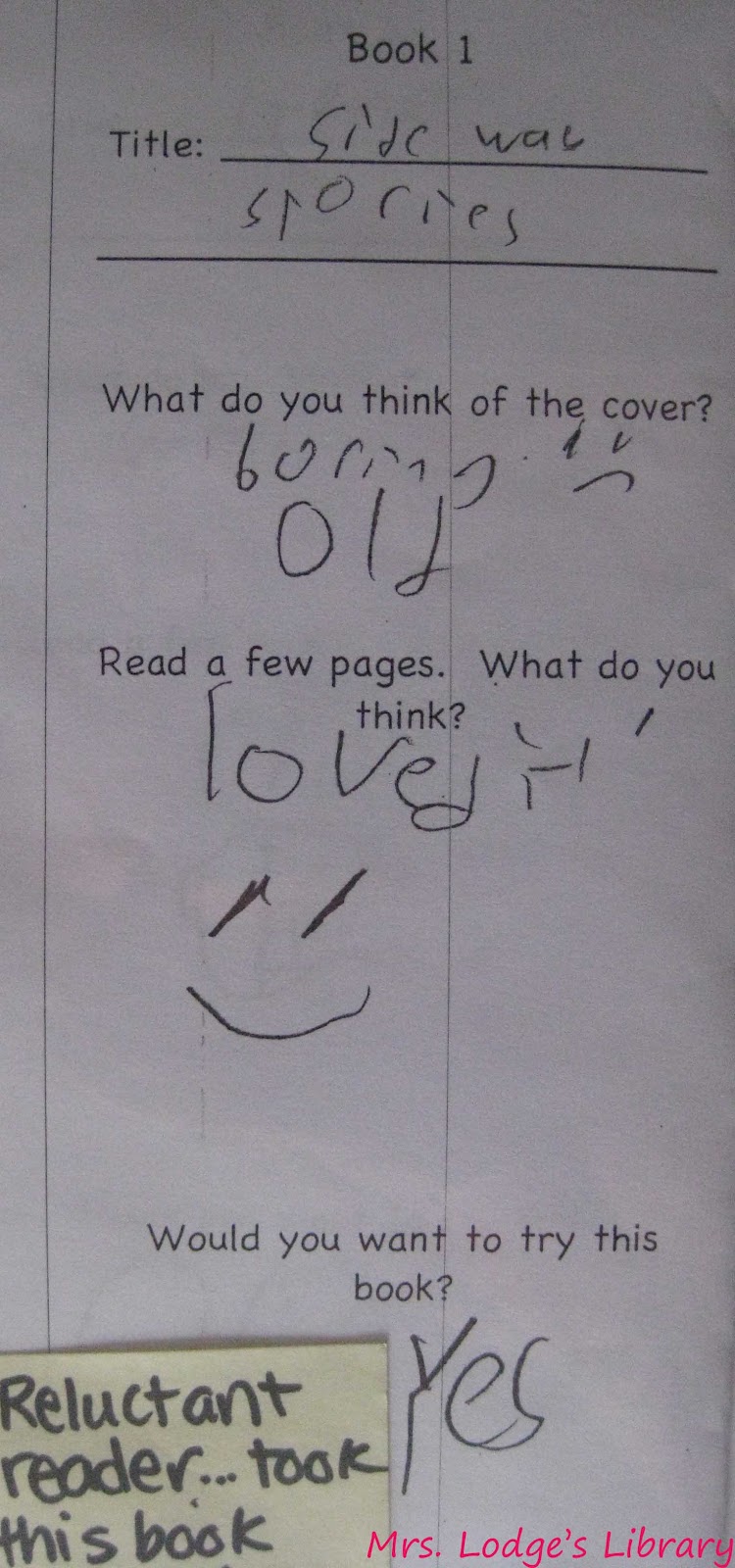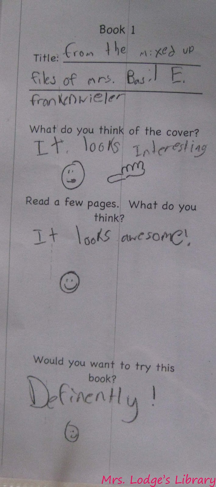 This is what my menus looked like, although I might change a few things in the future. On the left, you can see in my note to myself this book was taken out by a super reluctant reader. He never wants to take anything out, and his comments on the cover are basically his attitude toward most books I show him. But, he gave it a try and see what happened! On the right is one of my best, most excited readers who ended up taking one of my favorites, From the Mixed Up Files of Mrs. Basil E. Frankweiler.
