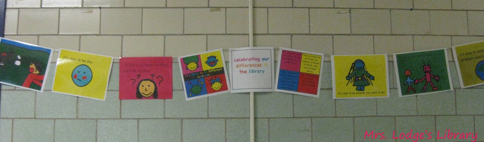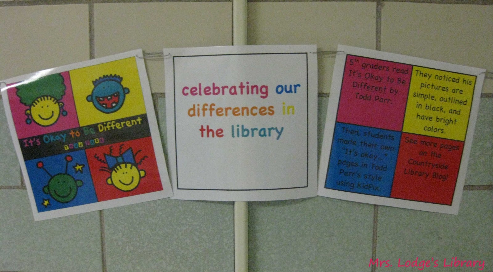 Last year, the theme at my previous school was "celebrating our differences". There were many activities we did to celebrate differences such as a cultural night. In the library, I read It's Okay to Be Different with my 5th graders. We talked about Todd Parr's illustrations and how we could create illustrations in his style. Using KidPix, the kids made their own page for It's Okay to Be Different. We hung the pictures down the hall:
